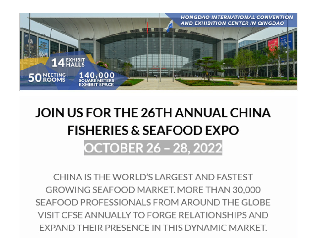 2022 China Fisheries & Seafood Expo aura lieu à Qingdao dans le 26 au 28 octobre 2022